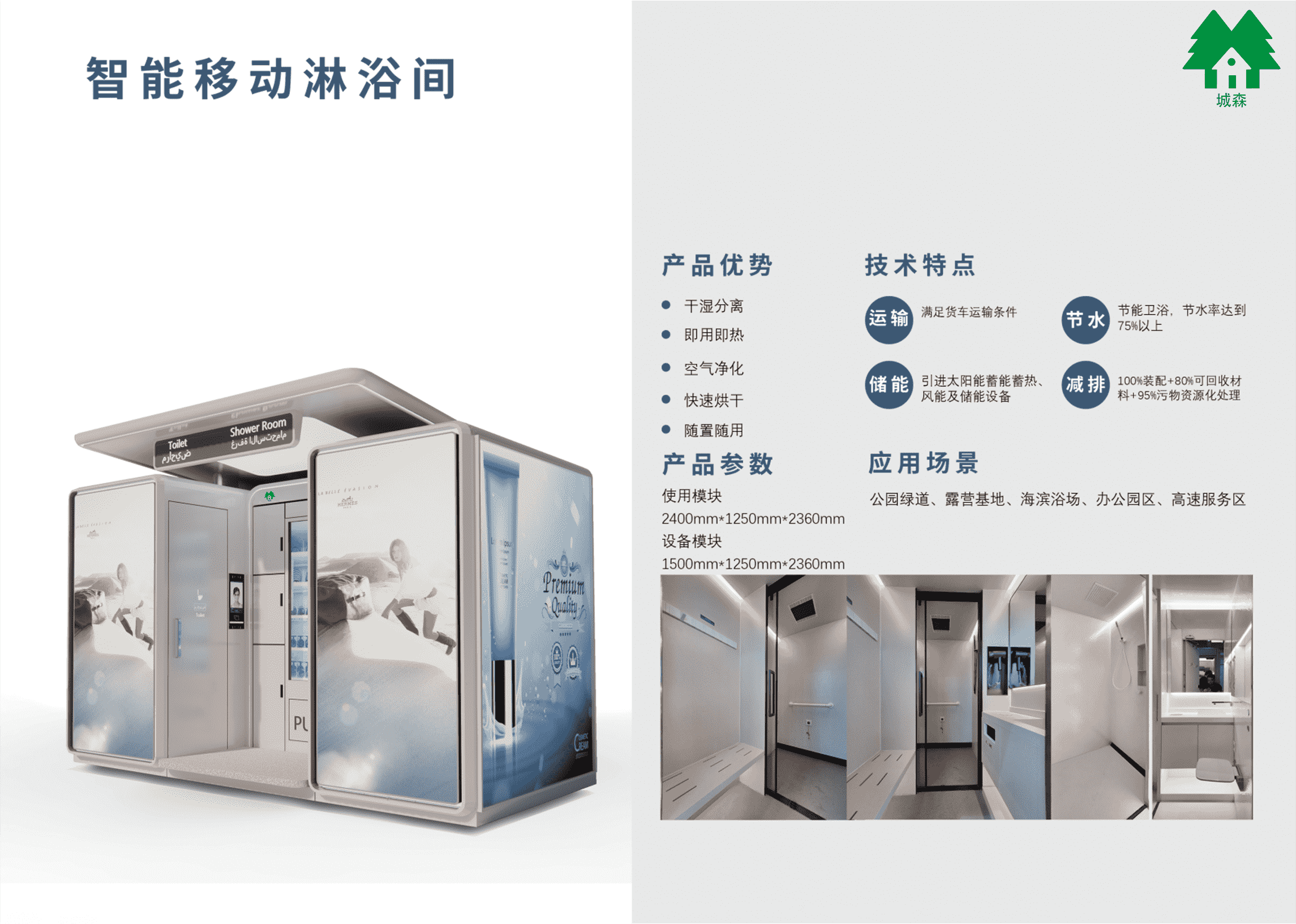 便捷移动:拖挂即走,快速部署,无需基建; 智能恒温:精准控温,即开即洗,节水节能; 自洁灭菌:UV+臭氧双效消毒,一客一净; 全场景适配:工地、露营、展会、应急救灾皆可用; 水电无忧:大容量水箱+电池,支持离网运行。